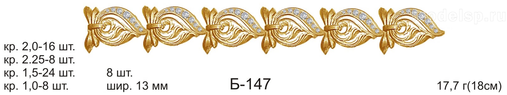 вес в золоте 17,7г. ширина 13,0мм. круг 2,0-16шт. круг 2,25-8шт. круг 1,5-24шт. круг 1,0-8шт.